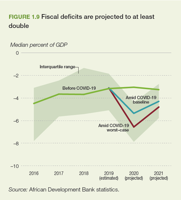 The pandemic will lead to a great cyclical increase in fiscal deficits in Africa. It will happen in a two-fold process of decreasing government revenues and increasing fiscal expenditures to boost demand in the economy. In 2020, the deficits have been predicted to rise to 8% – 9% of the GDP, depending on the severity of the situation.