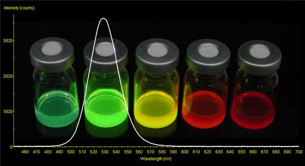 Quantum dots have properties in between bulk semiconductors and discrete atoms or molecules. Their optoelectronic properties vary because of their size. Larger quantum dots of bigger diameter emit longer wavelengths, like Orange or Red, and those with smaller diameter emits shorter wavelengths of light like Green and Blue.