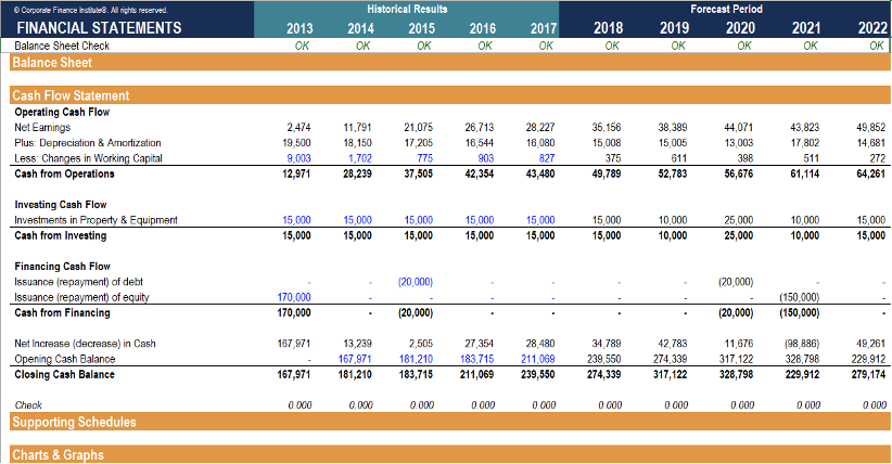 These three statements are dynamically linked with formulas in Excel and financial analysis is then performed on the model.