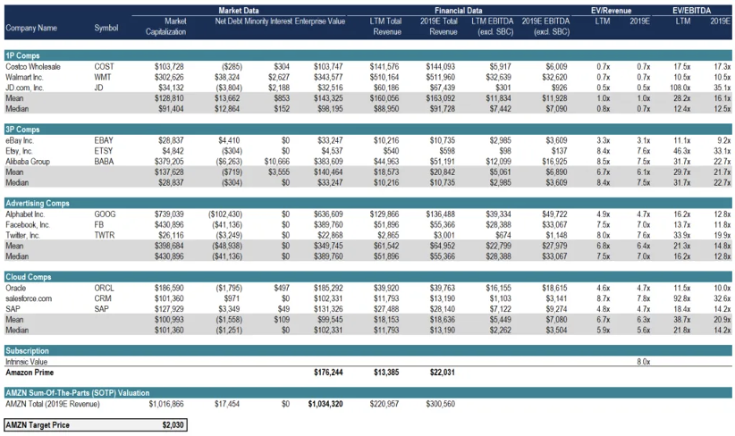 In the following example, the multinational company Amazon has been divided into different separately valued segments and then added together at the end.