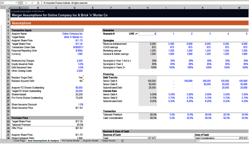 As the name implies, the M&A Model is an analysis of the combination of two companies that come together through an M&A process. A merger is the “combination” of two companies, under a mutual agreement, to form a single entity. An acquisition occurs when one company completely takes over the other company. In both cases, a single company emerges. This is usually done to reduce competition, increase operational efficiency and for growth.